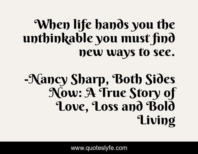 This page presents the quote "When life hands you the unthinkable you must find new ways to see.". Author of this quote is Nancy Sharp, Both Sides Now: A True Story of Love, Loss and Bold Living. This quote is about loss, nancy-sharp-both-sides-now, tasting-life-with-nancy-sharp, inspirational, enthusiasm, nancy-sharp-bold-living, nancy-sharp-vivid-living,.