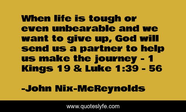 This page presents the quote "When life is tough or even unbearable and we want to give up, God will send us a partner to help us make the journey - 1 Kings 19 & Luke 1:39 - 56". Author of this quote is John Nix-McReynolds. This quote is about gospel, christian, inspiration,.