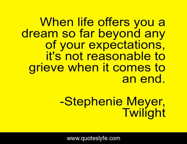 This page presents the quote "When life offers you a dream so far beyond any of your expectations, it's not reasonable to grieve when it comes to an end.". Author of this quote is Stephenie Meyer, Twilight. This quote is about grief, failure, dream,.