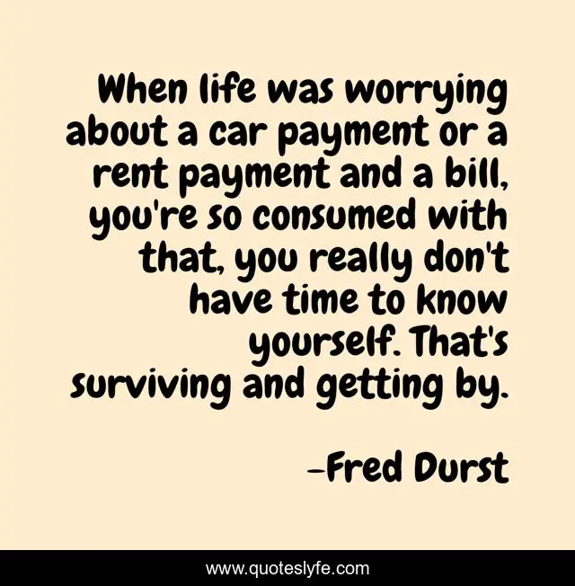 This page presents the quote "When life was worrying about a car payment or a rent payment and a bill, you're so consumed with that, you really don't have time to know yourself. That's surviving and getting by.". Author of this quote is Fred Durst. This quote is about life, time, yourself,.