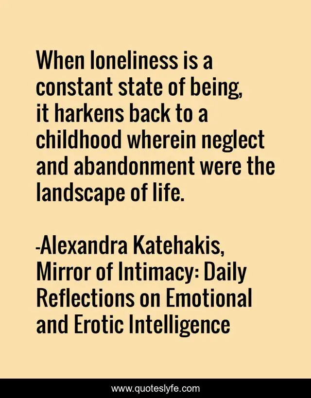 This page presents the quote "When loneliness is a constant state of being, it harkens back to a childhood wherein neglect and abandonment were the landscape of life.". Author of this quote is Alexandra Katehakis, Mirror of Intimacy: Daily Reflections on Emotional and Erotic Intelligence. This quote is about loneliness, abandonment, childhood, neglect,.