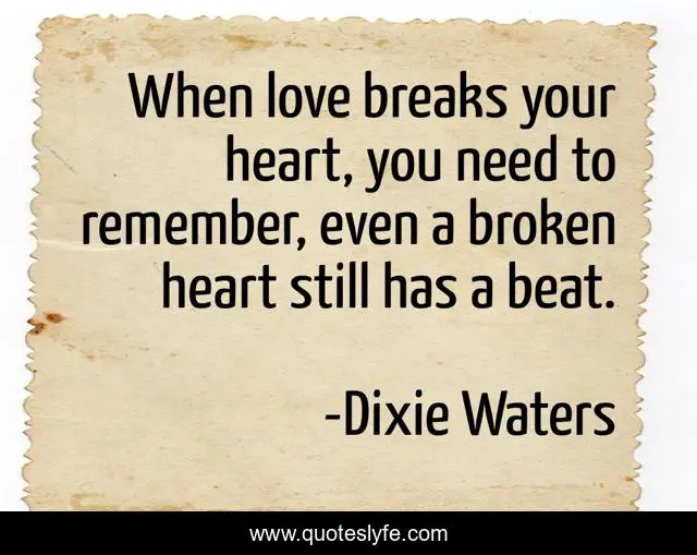 This page presents the quote "When love breaks your heart, you need to remember, even a broken heart still has a beat.". Author of this quote is Dixie Waters. This quote is about heart, heartbreak, love, affection, positive-thoughts,.