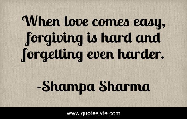 This page presents the quote "When love comes easy, forgiving is hard and forgetting even harder.". Author of this quote is Shampa Sharma. This quote is about life, love, pine, wisdom, forgetting, disappointment, pain, forgiving, affection,.