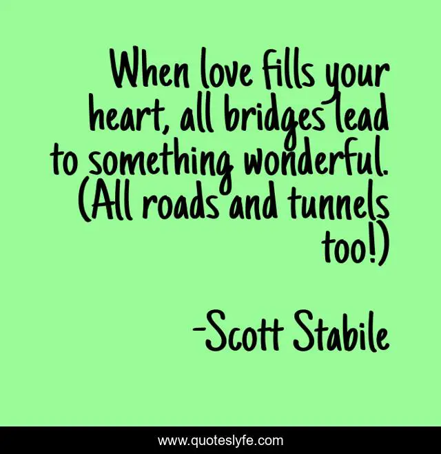 This page presents the quote "When love fills your heart, all bridges lead to something wonderful. (All roads and tunnels too!)". Author of this quote is Scott Stabile. This quote is about compassion, heart, kindness, love, affection,.