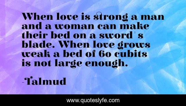 This page presents the quote "When love is strong a man and a woman can make their bed on a sword's blade. When love grows weak a bed of 60 cubits is not large enough.". Author of this quote is Talmud. .