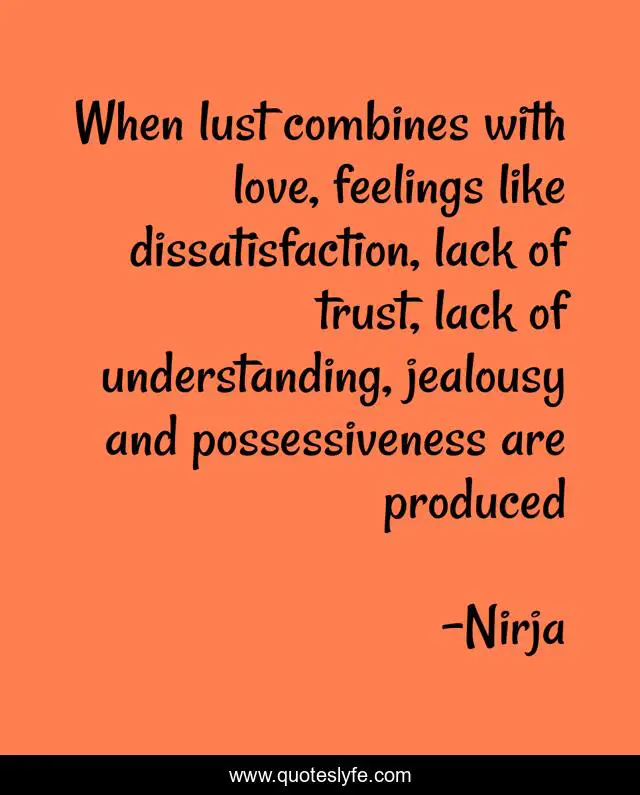 This page presents the quote "When lust combines with love, feelings like dissatisfaction, lack of trust, lack of understanding, jealousy and possessiveness are produced". Author of this quote is Nirja. This quote is about love, possessiveness, jealousy, feelings, lust, affection,.