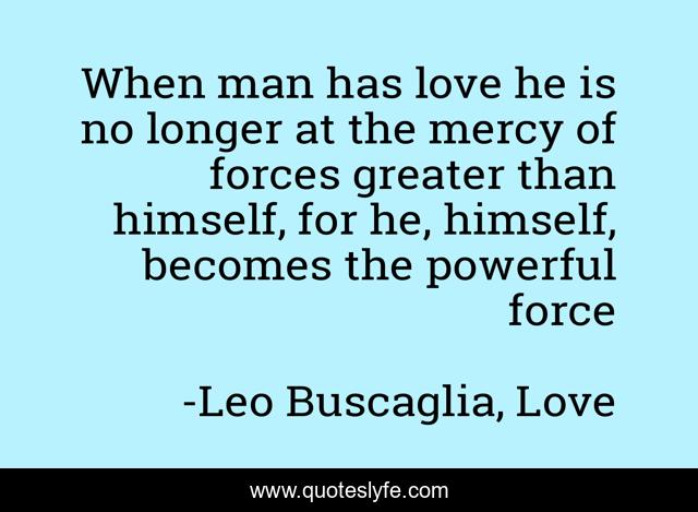 This page presents the quote "When man has love he is no longer at the mercy of forces greater than himself, for he, himself, becomes the powerful force". Author of this quote is Leo Buscaglia, Love. This quote is about mercy, love, power, affection,.
