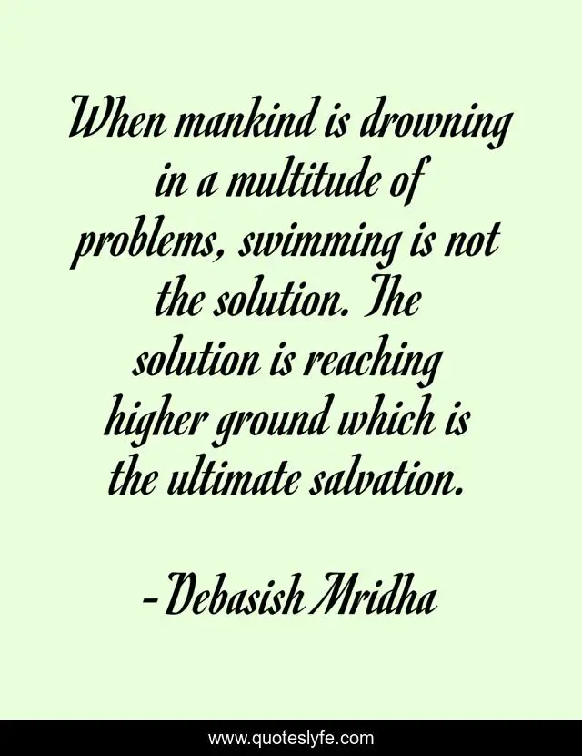 This page presents the quote "When mankind is drowning in a multitude of problems, swimming is not the solution. The solution is reaching higher ground which is the ultimate salvation.". Author of this quote is Debasish Mridha. This quote is about philosophy, debasish-mridha, quotes, higher-ground, mankind-is-drowning, inspirational, ultimate-salvation, enthusiasm, how-to-save-mankind,.