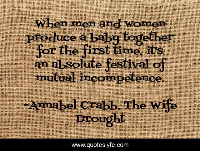 This page presents the quote "When men and women produce a baby together for the first time, it's an absolute festival of mutual incompetence.". Author of this quote is Annabel Crabb, The Wife Drought. This quote is about equality, incompetence, humor,.
