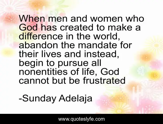 This page presents the quote "When men and women who God has created to make a difference in the world, abandon the mandate for their lives and instead, begin to pursue all nonentities of life, God cannot but be frustrated". Author of this quote is Sunday Adelaja. This quote is about all, difference, world, created, pursue, god, make, life, begin,.