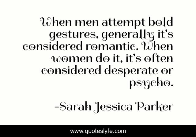 This page presents the quote "When men attempt bold gestures, generally it's considered romantic. When women do it, it's often considered desperate or psycho.". Author of this quote is Sarah Jessica Parker. This quote is about men, romantic, bold,.