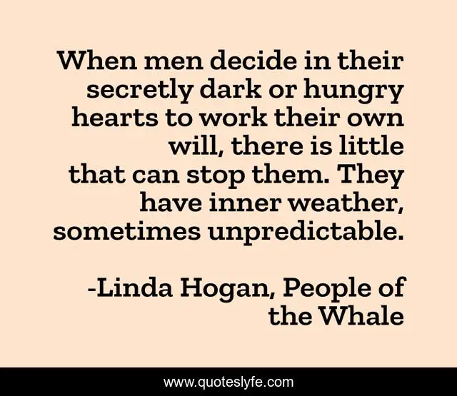 This page presents the quote "When men decide in their secretly dark or hungry hearts to work their own will, there is little that can stop them. They have inner weather, sometimes unpredictable.". Author of this quote is Linda Hogan, People of the Whale. This quote is about men, darkness,.