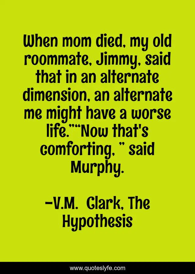 This page presents the quote "When mom died, my old roommate, Jimmy, said that in an alternate dimension, an alternate me might have a worse life.”“Now that's comforting, ” said Murphy.". Author of this quote is V.M. Clark, The Hypothesis. .