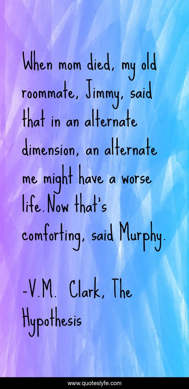 This page presents the quote "When mom died, my old roommate, Jimmy, said that in an alternate dimension, an alternate me might have a worse life.Now that's comforting, said Murphy.". Author of this quote is V.M. Clark, The Hypothesis. .