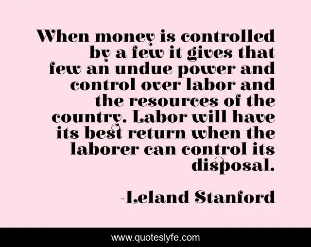 This page presents the quote "When money is controlled by a few it gives that few an undue power and control over labor and the resources of the country. Labor will have its best return when the laborer can control its disposal.". Author of this quote is Leland Stanford. This quote is about control, money, best,.