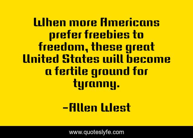 This page presents the quote "When more Americans prefer freebies to freedom, these great United States will become a fertile ground for tyranny.". Author of this quote is Allen West. This quote is about tyranny, great,.