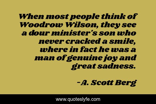 This page presents the quote "When most people think of Woodrow Wilson, they see a dour minister's son who never cracked a smile, where in fact he was a man of genuine joy and great sadness.". Author of this quote is A. Scott Berg. This quote is about joy, great, son,.