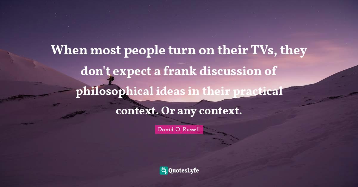 This page presents the quote "When most people turn on their TVs, they don't expect a frank discussion of philosophical ideas in their practical context. Or any context.". Author of this quote is David O. Russell. This quote is about frank, tvs, people, discussion, philosophical, ideas,.