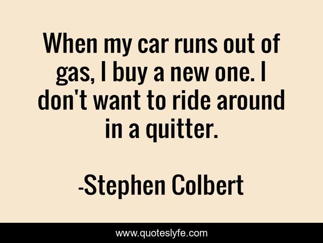 This page presents the quote "When my car runs out of gas, I buy a new one. I don't want to ride around in a quitter.". Author of this quote is Stephen Colbert. This quote is about new, ride,.