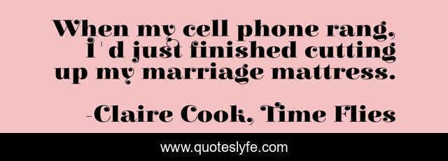 This page presents the quote "When my cell phone rang, I'd just finished cutting up my marriage mattress.". Author of this quote is Claire Cook, Time Flies. This quote is about reinvention, divorce, women-s-fiction, friendship, inspiration,.