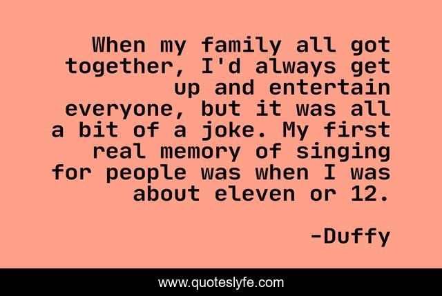 This page presents the quote "When my family all got together, I'd always get up and entertain everyone, but it was all a bit of a joke. My first real memory of singing for people was when I was about eleven or 12.". Author of this quote is Duffy. This quote is about memory, together, people,.