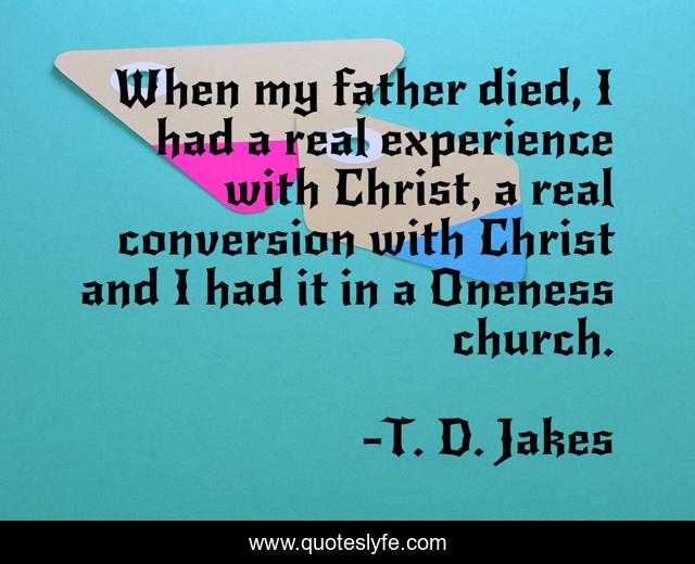 This page presents the quote "When my father died, I had a real experience with Christ, a real conversion with Christ and I had it in a Oneness church.". Author of this quote is T. D. Jakes. This quote is about real, father, church,.