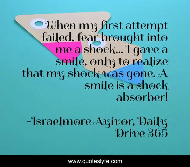This page presents the quote "When my first attempt failed, fear brought into me a shock... I gave a smile, only to realize that my shock was gone. A smile is a shock absorber!". Author of this quote is Israelmore Ayivor, Daily Drive 365. This quote is about absorber, afraid, attempt, israelmore-ayivor, absorb, shock-absorber, food-for-thought, give-a-smile, shock,.