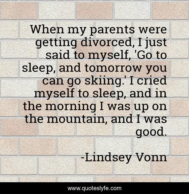 This page presents the quote "When my parents were getting divorced, I just said to myself, 'Go to sleep, and tomorrow you can go skiing.' I cried myself to sleep, and in the morning I was up on the mountain, and I was good.". Author of this quote is Lindsey Vonn. This quote is about myself, good, parents,.