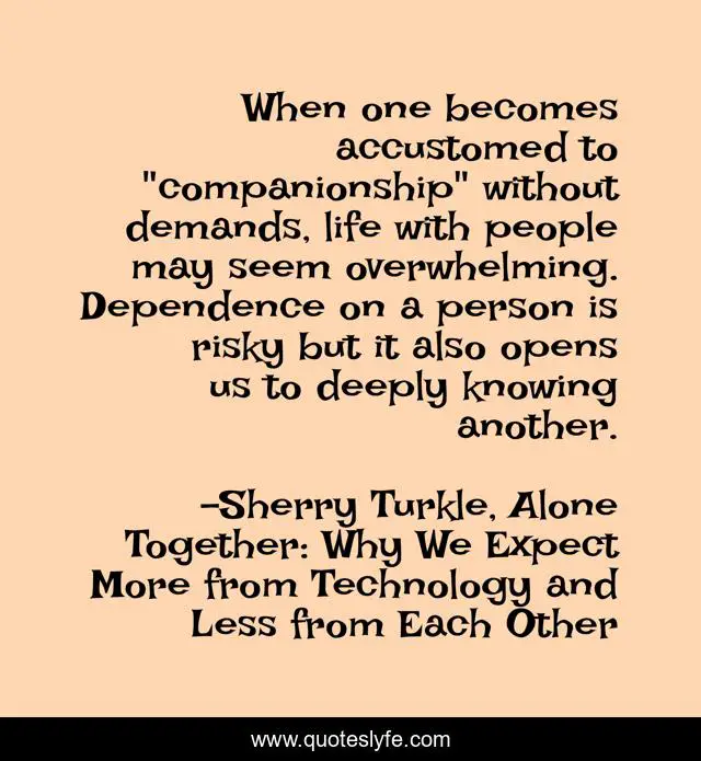 This page presents the quote "When one becomes accustomed to "companionship" without demands, life with people may seem overwhelming. Dependence on a person is risky but it also opens us to deeply knowing another.". Author of this quote is Sherry Turkle, Alone Together: Why We Expect More from Technology and Less from Each Other. This quote is about media, idolatry, technology, manipulation,.