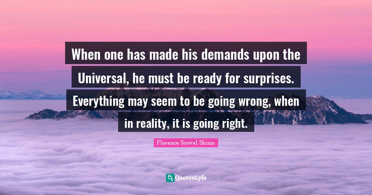 This page presents the quote "When one has made his demands upon the Universal, he must be ready for surprises. Everything may seem to be going wrong, when in reality, it is going right.". Author of this quote is Florence Scovel Shinn. This quote is about reality, may, demand, universal, made, ready,.