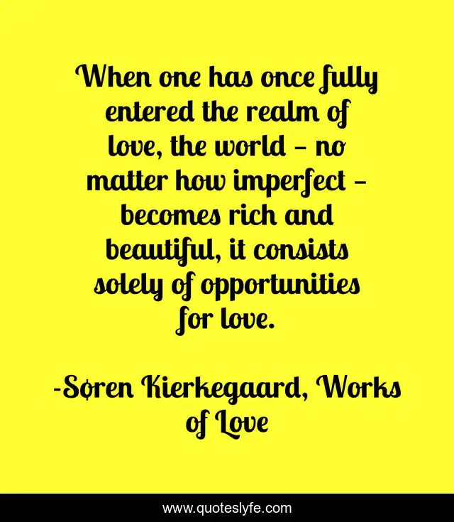 This page presents the quote "When one has once fully entered the realm of love, the world — no matter how imperfect — becomes rich and beautiful, it consists solely of opportunities for love.". Author of this quote is Søren Kierkegaard, Works of Love. This quote is about christian-love, love, agape, affection, christianity,.