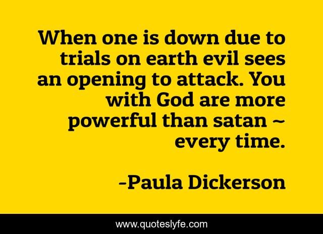 This page presents the quote "When one is down due to trials on earth evil sees an opening to attack. You with God are more powerful than satan ~ every time.". Author of this quote is Paula Dickerson. This quote is about god, holy-spirit, jesus,.