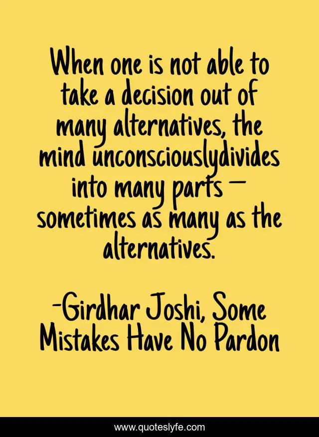This page presents the quote "When one is not able to take a decision out of many alternatives, the mind unconsciouslydivides into many parts – sometimes as many as the alternatives.". Author of this quote is Girdhar Joshi, Some Mistakes Have No Pardon. This quote is about decision, alternatives,.