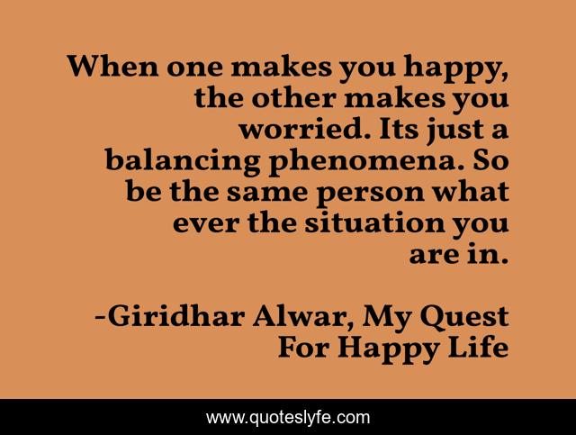 This page presents the quote "When one makes you happy, the other makes you worried. Its just a balancing phenomena. So be the same person what ever the situation you are in.". Author of this quote is Giridhar Alwar, My Quest For Happy Life. This quote is about balanced-life, inspirational, sad, life-lessons, enthusiasm, happy,.