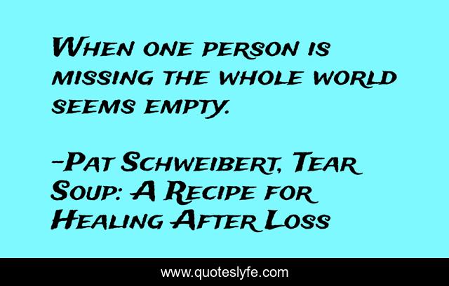 This page presents the quote "When one person is missing the whole world seems empty.". Author of this quote is Pat Schweibert, Tear Soup: A Recipe for Healing After Loss. This quote is about grief, loss, mourning,.