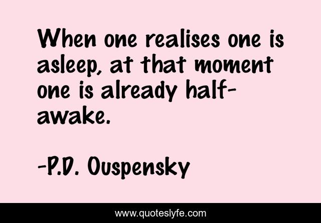 This page presents the quote "When one realises one is asleep, at that moment one is already half-awake.". Author of this quote is P.D. Ouspensky. This quote is about awakening, truth, reality,.