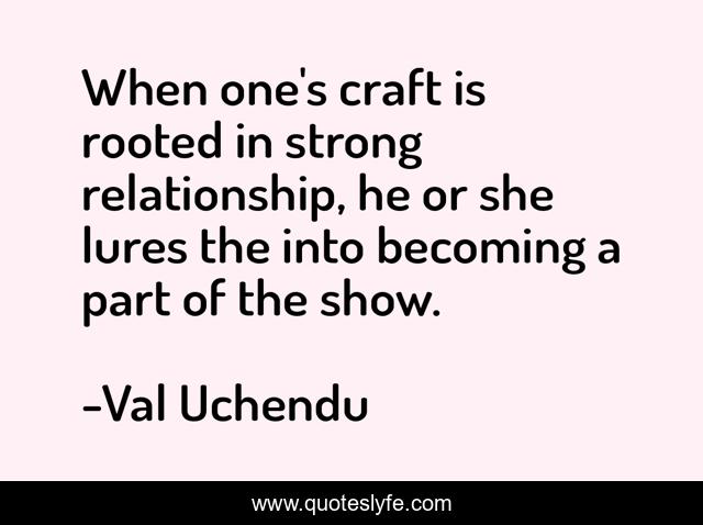 This page presents the quote "When one's craft is rooted in strong relationship, he or she lures the into becoming a part of the show.". Author of this quote is Val Uchendu. This quote is about movie, play, artists, relationship, show,.