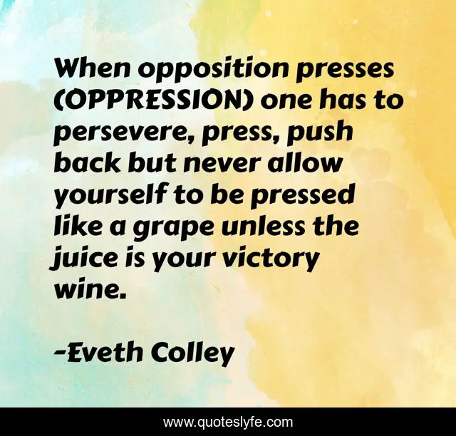 This page presents the quote "When opposition presses (OPPRESSION) one has to persevere, press, push back but never allow yourself to be pressed like a grape unless the juice is your victory wine.". Author of this quote is Eveth Colley. This quote is about persevere, oppression, victory,.
