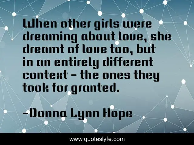 This page presents the quote "When other girls were dreaming about love, she dreamt of love too, but in an entirely different context - the ones they took for granted.". Author of this quote is Donna Lynn Hope. This quote is about love, family, parentless, loneliness, orphan, alone, orphans, affection,.