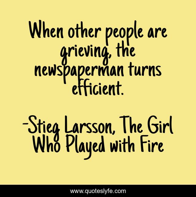 This page presents the quote "When other people are grieving, the newspaperman turns efficient.". Author of this quote is Stieg Larsson, The Girl Who Played with Fire. This quote is about grief, news, newspapers, death,.