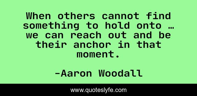 This page presents the quote "When others cannot find something to hold onto … we can reach out and be their anchor in that moment.". Author of this quote is Aaron Woodall. This quote is about suicide, inspirational, strength, hope, listening, enthusiasm, depression, help,.