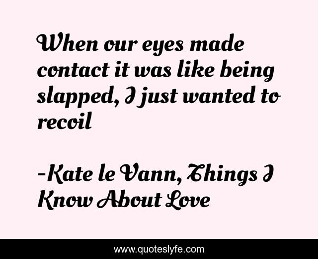 This page presents the quote "When our eyes made contact it was like being slapped, I just wanted to recoil". Author of this quote is Kate le Vann, Things I Know About Love. .