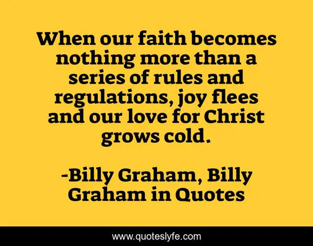 This page presents the quote "When our faith becomes nothing more than a series of rules and regulations, joy flees and our love for Christ grows cold.". Author of this quote is Billy Graham, Billy Graham in Quotes. This quote is about faith, billy-graham,.