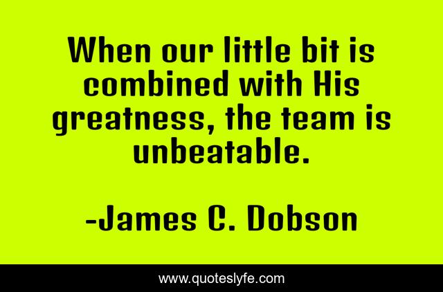 This page presents the quote "When our little bit is combined with His greatness, the team is unbeatable.". Author of this quote is James C. Dobson. This quote is about little-bit, his, unbeatable, greatness, team, our,.