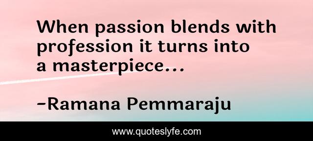 This page presents the quote "When passion blends with profession it turns into a masterpiece...". Author of this quote is Ramana Pemmaraju. This quote is about life, enjoyment, philosophy, professionalism, job, passion,.