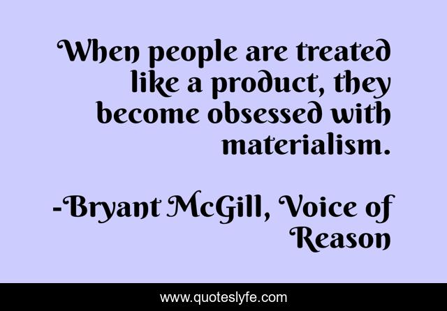This page presents the quote "When people are treated like a product, they become obsessed with materialism.". Author of this quote is Bryant McGill, Voice of Reason. This quote is about essence-of-life, obssession, materialism,.