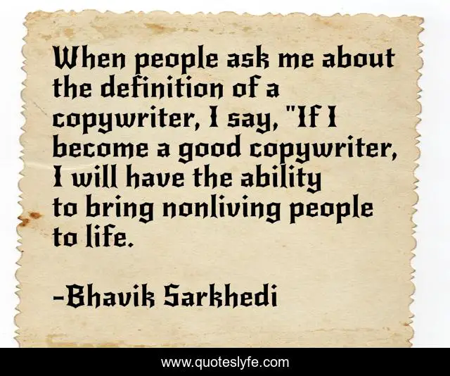 This page presents the quote "When people ask me about the definition of a copywriter, I say, "If I become a good copywriter, I will have the ability to bring nonliving people to life.". Author of this quote is Bhavik Sarkhedi. .