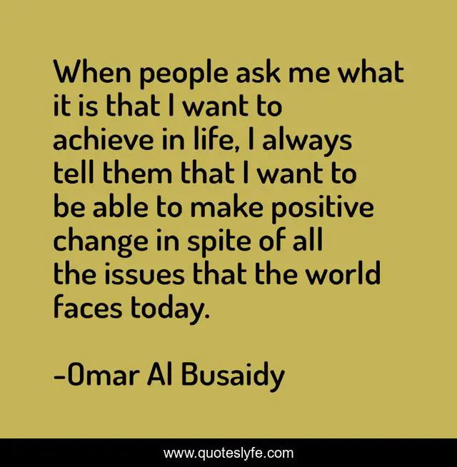 This page presents the quote "When people ask me what it is that I want to achieve in life, I always tell them that I want to be able to make positive change in spite of all the issues that the world faces today.". Author of this quote is Omar Al Busaidy. This quote is about enthusiasm, change, inspirational, life-goals,.