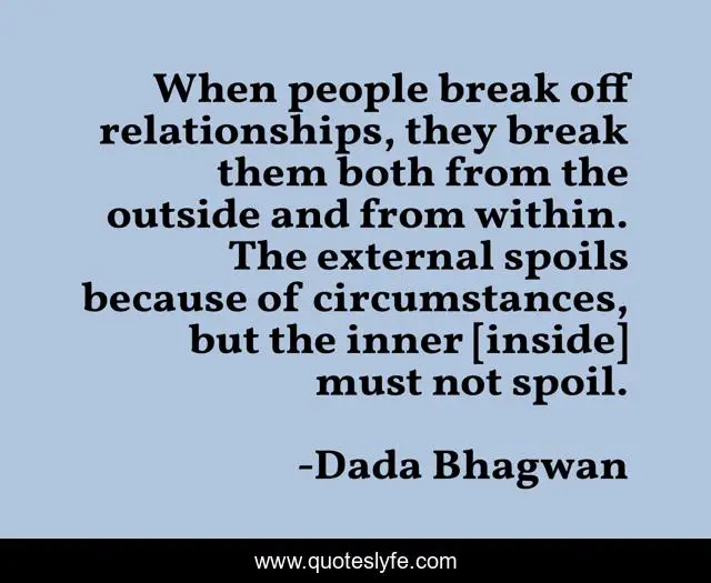 This page presents the quote "When people break off relationships, they break them both from the outside and from within. The external spoils because of circumstances, but the inner [inside] must not spoil.". Author of this quote is Dada Bhagwan. This quote is about relationships, inside, spiritual, spoil,.
