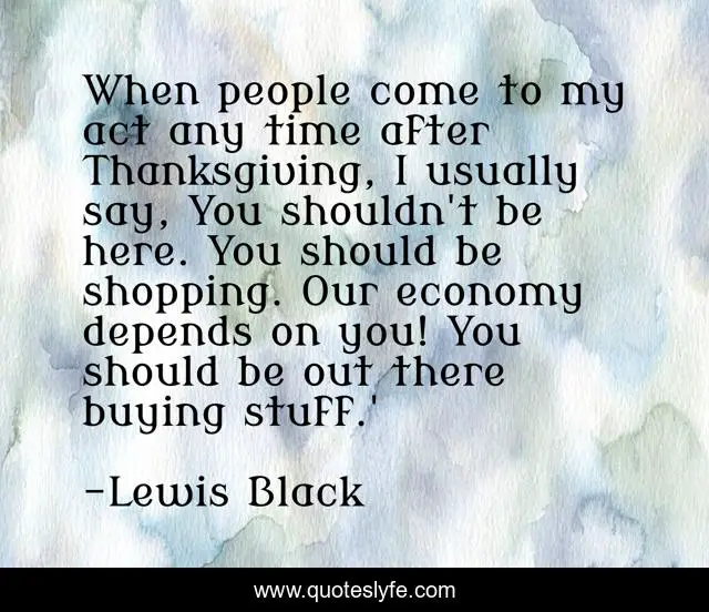 This page presents the quote "When people come to my act any time after Thanksgiving, I usually say, You shouldn't be here. You should be shopping. Our economy depends on you! You should be out there buying stuff.'". Author of this quote is Lewis Black. This quote is about time, shopping, people,.